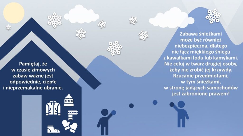 - Noś odpowiedni ubiór: czapkę, szalik, rękawiczki, nieprzemakalne buty.