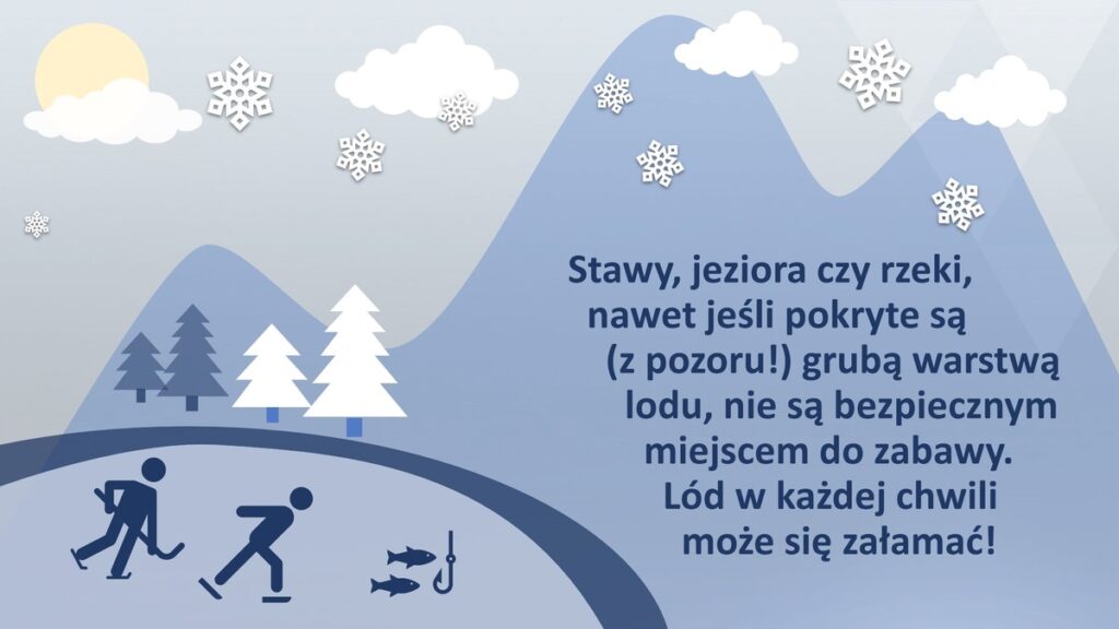 - Nie wchodź na zamarznięte jeziora, rzeki i stawy – lód może być cienki.