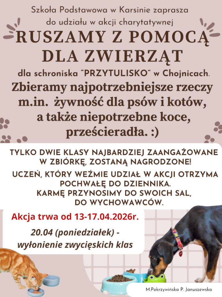 Zbieramy żywność dla psów i kotów, koce, prześcieradła i akcesoria dla podopiecznych schroniska. Przyniesione rzeczy zostawiamy u wychowawców, w swoich klasach.